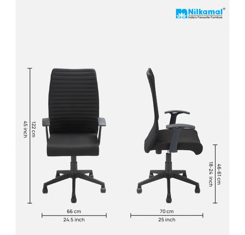 Give your workspace the comfort and appeal it deserves with the Nilkamal Thames Neo High Back Chair. Its moulded PU foam seat with a tubular back frame is upholstered in fabric for enhanced softness. It features a pushback mechanism to adjust the backrest independently, with fixed polypropylene armrests on the sides for additional support. Further, the chair has a 100 mm Gas lift stroke to modify the height according to your liking for a comfortable sitting experience. In addition, the high back design of the chair reduces the strain on your neck and shoulders while providing you with complete relaxation. The elegant design of the table in a classy black shade works with any décor style. With all these features, the Thames Neo High Back Chair can be the perfect addition to any workspace or home office.
