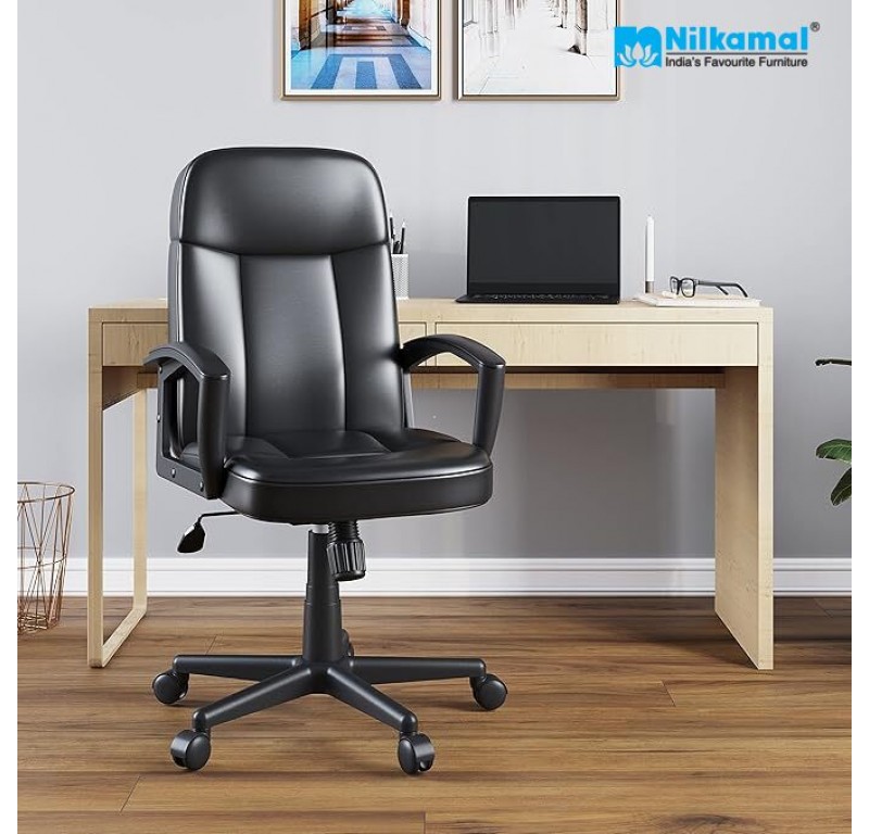 Remain productive and comfortable all day long with the Mayor Medium Back Chair. As this is a Medium back chair, it supports your spine’s natural curve while sitting. It comprises a soft PU cushioned seat and back with PP arms having soft PU pads to support while working. When the chair is tilted backwards, the knee-tilt mechanism keeps your feet on the ground for better relaxation. Its nylon star base distributes the structure’s weight and twin-wheel nylon castors enable smooth movement across surfaces. This piece by Nilkamal in black gives your interiors a sophisticated and elegant appeal that works well with most settings. With its striking and eye-catching design, the Mayor Medium Back Chair will be a great aesthetic addition to your workspace.